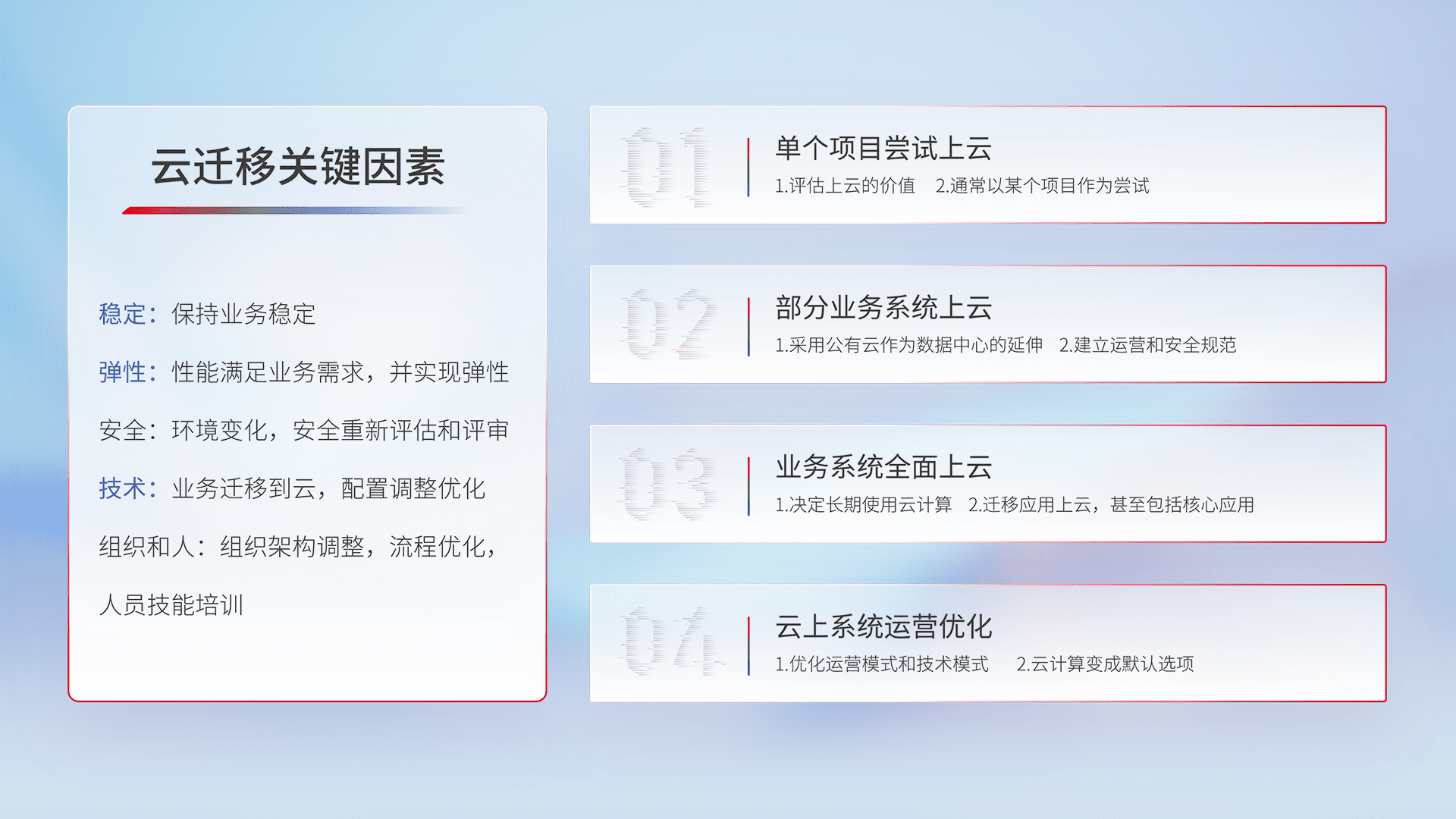 结合实际业务,,,,从规划设计、、、云平台选型、、云原生改造、、、数据迁移、、、集成交付,,,,迁移全过程为客户识别最佳上云路径,,,,做好风险识别管理,,,设计网络架构、、、身份权限、、安全审计合规、、、、操作审计、、日志审计、、、、监控告警策略、、、多站点容灾设计等,,,对云上基础设施进行整体规划,,,,提升IT治理水平,,以满足弹性、、、高可用、、高性能的需求。。。