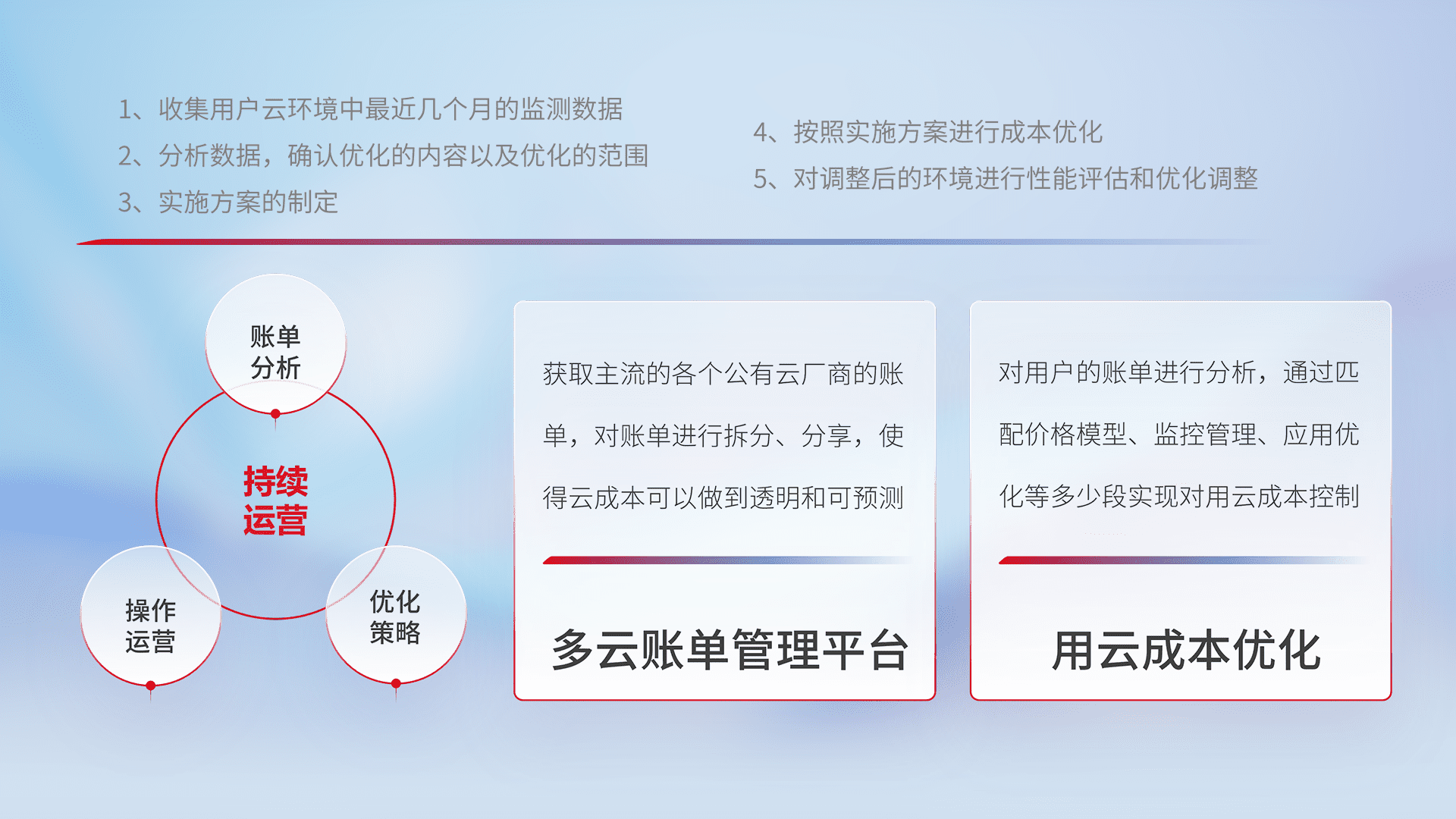 通过多云纳管,,,以统一的资源数据模型把客户的云资源进行抽象和封装,,,进而实现对多云资源的统一操作,,,保障云资源管理的可靠性、、、稳定性与可用性。。。量身定制化运维内容,,配置、、、开发运维、、、、补丁管理、、、、备份、、、监控、、认证和访问管理、、审计和日常巡检等,,,,保障在用云过程中的可靠度,,稳定度以及高可用率。。。