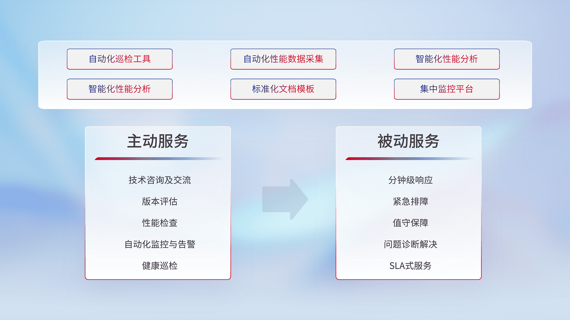 智能化工具和标准化文档,,,,保障服务质量,,,提供主动服务(包含技术咨询、、、版本评估、、、性能检查、、、自动化监控与告警、、、、健康巡检)和被动服务包含(分钟级响应、、、、紧急排障、、、、值守保障、、、问题诊断解决、、、SLA服务)。。